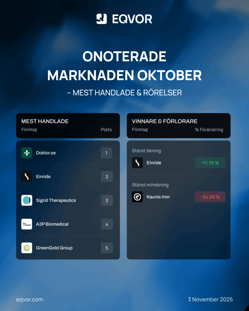 Onoterade marknaden Oktober Under oktober såg vi tydliga rörelser bland flera av de onoterade bolagen hos Eqvor. De mest handlade onoterade bolagen räknat i antalet[…]